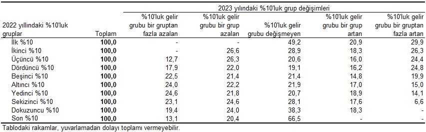 Eşdeğer hanehalkı kullanılabilir fert gelirine göre sıralı %10’luk gelir grupları itibarıyla fertlerin bir önceki yıla göre yüzdelik geçişleri incelendiğinde; bir önceki yılda birinci %10’luk grupta olan fertlerin 2023 yılında %49,2’sinin, son %10’luk grupta olan fertlerin ise %66,5’inin gelir grubu değişmedi. Ayrıca 2022 yılında birinci %10’luk grupta olan fertlerin %29,9’unun 2023 yılında gelir grubu birden fazla yükseldi. Son %10’luk grupta olan fertlerin ise %13,1’inin gelir grubu birden fazla düştü.