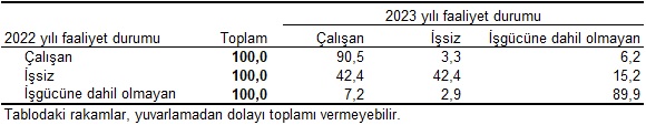 Gelir ve Yaşam Koşulları Araştırması panel veriden elde edilen sonuçlara göre 2022 yılında işsiz olan fertlerin %42,4’ü 2023 yılında çalışmaya başladı. Faaliyet durumu 2022 yılında çalışan olarak belirlenen fertlerin 2023 yılında %90,5’i çalışma hayatına devam etti. Bir önceki yıl işgücüne dahil olmayan fertlerin ise %10,1’i işgücüne katıldı.