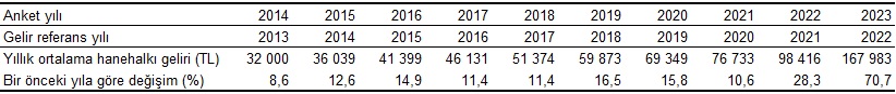Türkiye’de yıllık ortalama hanehalkı kullanılabilir geliri 2023 yılı anket sonuçlarına göre %70,7 artarak 167 bin 983 TL oldu.