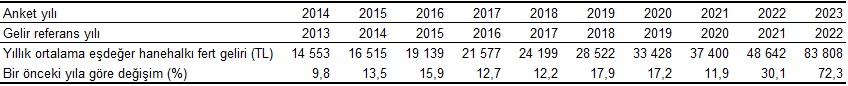 Gelir Dağılımı İstatistiklerinin hesaplandığı Gelir ve Yaşam Koşulları Araştırması 2023 yılı sonuçlarına ilişkin gelir bilgileri, bir önceki takvim yılı olan 2022 yılını referans almaktadır. Gelir hesaplamalarında; hanehalkı gelirleri, büyüklüğü ve kompozisyonu dikkate alınarak eşdeğer hanehalkı kullanılabilir fert gelirine dönüştürülmektedir.