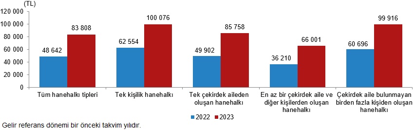 Yıllık ortalama eşdeğer hanehalkı kullanılabilir fert gelirlerinde en yüksek gelir, geçen yıla göre 37 bin 522 TL artarak 100 bin 076 TL ile tek kişilik hanehalklarının oldu. Çekirdek aile bulunmayan birden fazla kişiden oluşan hanehalklarının yıllık ortalama eşdeğer hanehalkı kullanılabilir fert geliri 99 bin 916 TL iken tek çekirdek aileden oluşan hanehalklarında bu değer 85 bin 758 TL oldu. En düşük yıllık ortalama eşdeğer kullanılabilir hanehalkı fert gelirine sahip hanehalkı tipi ise 66 bin 001 TL ile en az bir çekirdek aile ve diğer kişilerden oluşan hanehalkları oldu.