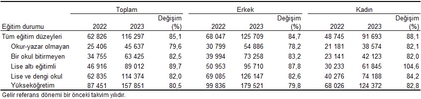 Yıllık ortalama esas iş gelirleri sırasıyla yükseköğretim mezunlarında 157 bin 851 TL, lise ve dengi okul mezunlarında 114 bin 374 TL, lise altı eğitimlilerde 89 bin 012 TL, bir okul bitirmeyenlerde 63 bin 425 TL ve okur-yazar olmayan fertlerde 45 bin 637 TL olarak hesaplandı. Geçen yıla göre yıllık ortalama esas iş gelirinde en yüksek artış %89,7 ile lise altı eğitimli, en düşük artış ise %79,6 ile okur-yazar olmayan fertlerde oldu.
