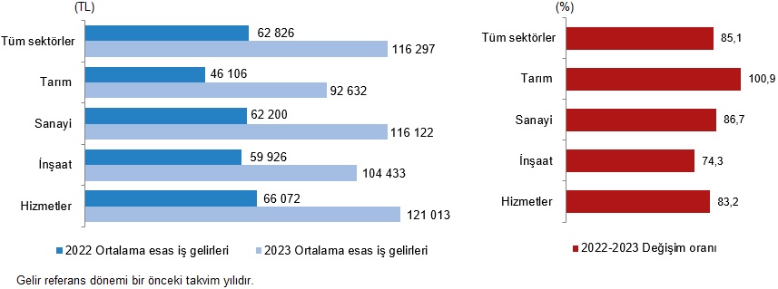 Esas iş gelirleri sektörel ayrımda incelendiğinde; en yüksek yıllık ortalama gelirin 121 bin 013 TL ile hizmet sektöründe, en düşük yıllık ortalama gelirin ise 92 bin 632 TL ile tarım sektöründe olduğu görüldü. Bir önceki yıla göre; yıllık ortalama esas iş gelirinde en yüksek artış %100,9 ile tarım sektöründe gözlenirken, bunu %86,7 ile sanayi sektörü izledi. Diğer taraftan hizmet sektöründe %83,2, inşaat sektöründe ise %74,3 artış gözlendi.