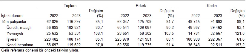Esas işteki durumlarına göre yıllık ortalama esas iş gelirleri (TL), 2022, 2023