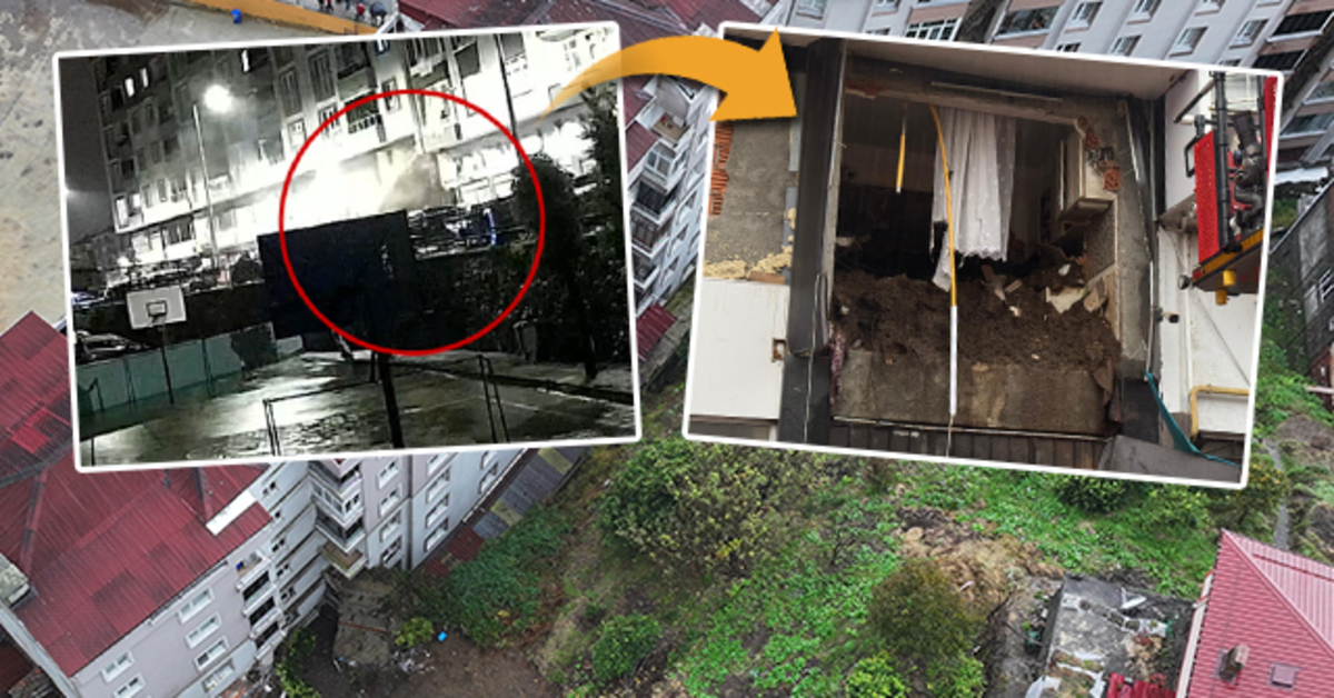 Yağışın etkili olduğu Çayeli ilçesine bağlı Eskipazar Mahallesi’nde 6 katlı bir apartmanın arka tarafında bulunan toprak kütlesi kaydı.