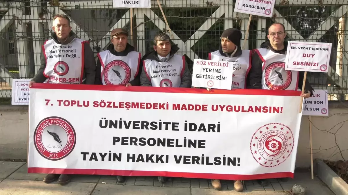 Üniversite İdari Personelleri Sendikası, üniversite idari personellerine tayin hakkı verilmesi amacıyla Çalışma ve Sosyal Güvenlik Bakanlığı önünde başlattıkları oturma eylemine 4’üncü gününde devam ediyor. Üniversite İdari Personelleri Sendikası Genel Başkanı İbrahim Güzel yaşadıkları soruna ilişkin yaptığı açıklamada şunları kaydetti: